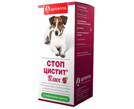 Стоп-цистит Плюс для собак. В 1 таблетке содержится: метионин 180 — 220 мг, L-теанин 45 — 55 мг, триптофан 9 — 11 мг, экстракт клюквы сухой 45 — 55 мг, экстракт брусники листа сухой 45 — 55 мг, автолизат пивных дрожжей 18 — 22 мг, а также вспомогательные вещества.