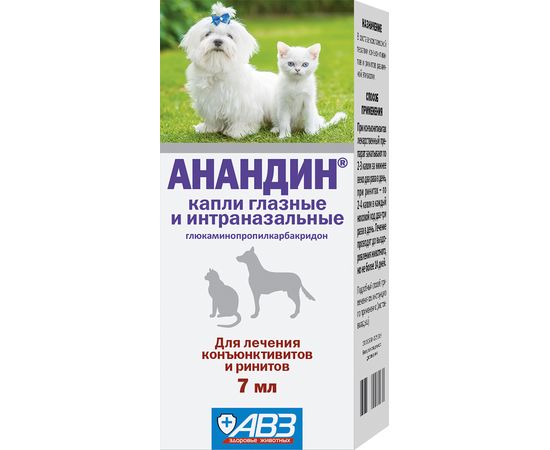 Капли глазные и интраназальные Анандин в 1 мл содержат глюкаминопропилкарбакридон (анандин) — 20 мг. Применяют в комплексной терапии конъюнктивитов и ринитов различной этиологии у собак и кошек.