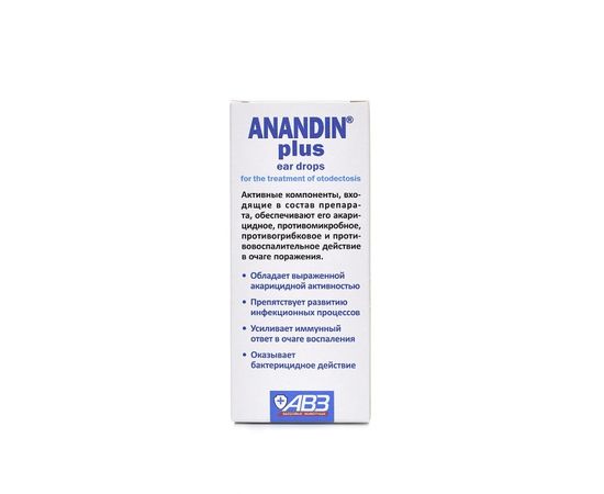 Капли ушные Анандин плюс относятся к акарицидным лекарственным препаратам для аурикулярного применения. Входящие в состав препарата активные компоненты обеспечивают акарицидное, противомикробное и противовоспалительное действие.