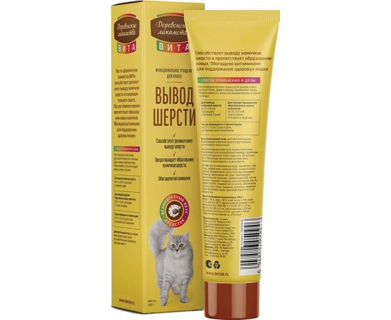Функциональная паста «Вита. Вывод шерсти» со вкусом креветки является незаменимым помощником в заботе о благополучии вашей кошки. Её уникальная формула помогает деликатно выводить комочки шерсти, накапливающиеся в пищеварительном тракте и при регулярном приеме способствует эффективному предотвращению появления новых комочков. Каждая порция пасты обогащена витаминами и минералами. Вкус креветки добавляет пасте привлекательности, что делает ее прием не только полезным, но и приятным времяпрепровождением для вашего питомца.