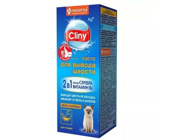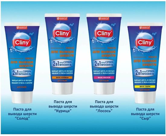 Паста для вывода шерсти Cliny способствует естественному выведению комков шерсти (безоаров) из желудка животных. Избавляет кошек от рвоты, потери аппетита, закупорки кишечника, запоров. Обладает привлекательным для кошек вкусом и ароматом солода.