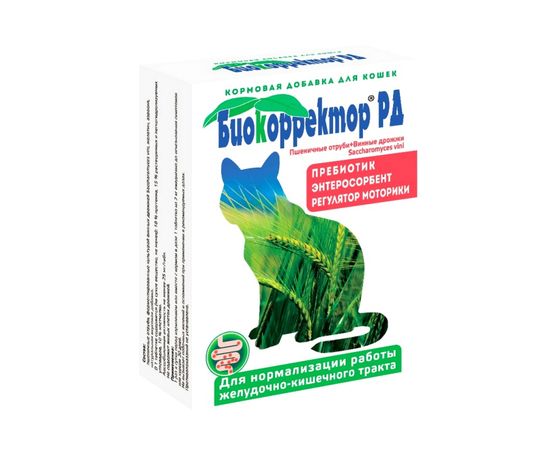 Добавка эффективно связывает и выводит из организма большой спектр токсических веществ (в т. ч. тяжелые металлы, бензол и фенолы), продукты незавершенного метаболизма, патогенные и условно патогенные микроорганизмы, а также аллергены. Адсорбционные свойства добавки определяются свойствами входящих в её состав пшеничных отрубей и винных дрожжей. Пшеничные отруби, обладая водоудерживающей и ионообменной способностью, адсорбируют на себе большой спектр вредных веществ (токсины, ионы тяжелых металлов). Входящие в состав кормовой добавки винные дрожжи усиливают адсорбционные свойства пшеничных отрубей. Стенки клеток винных дрожжей образованы биополимерами, состоящими из молекул, рецепторы которых схожи с рецепторами слизистой оболочки кишечника, поэтому патогенные микробы и их токсины "прикрепляются" вместо клеток эпителия к клеткам винных дрожжей и, не принося вреда организму животного, выводятся наружу. Биокорректор РД насыщает организм животного большим количеством ценнейших биологически активных веществ — пищевыми волокнами, микроэлементами, витаминами и аминокислотами. Кормовая добавка содержит высокоэффективные пребиотические компоненты, создающие условия для развития нормальной микрофлоры (как собственной, так и привнесенной с пробиотиками). Пребиотические свойства добавки определяются входящими в ее состав пшеничными отрубями и клетками винных дрожжей. Пористая структура экструдированных ("взорванных") отрубей отлично подходит для заселения, фиксации и размножения полезной микрофлоры в кишечнике. Пищевые волокна в составе отрубей не перевариваются в верхних отделах желудочно-кишечного тракта и являются энергетическим субстратом для представителей нормальной микрофлоры. Отруби в составе добавки ферментированы, т. е. их составные части уже частично расщеплены ферментами винных дрожжей до более мелких фрагментов, поэтому они быстрее проявляют пребиотический эффект. Винный компонент добавки — продукт метаболизма винных дрожжей — в сочетании с витамином В3 выступает источником питания для лакто- и бифидобактерий. Добавка содержит много грубых пищевых волокон, которые, действуя механически на нервные окончания, нормализуют моторно-эвакуационную функцию желудочно-кишечного тракта, восстанавливают пристеночное пищеварение и улучшают обмен веществ. Улучшенная моторика способствует нормализации пищеварения, ускоряет прохождение корма по кишечнику, предотвращая застой каловых масс и всасывание вредных веществ, стимулирует аппетит, повышает усвоение корма, очищает желудочно-кишечный тракт от комков шерсти и профилактирует многие заболевания органов пищеварения.
