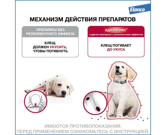 Адвантикс® - препарат от компании Elanco, помогает защитить собаку до укуса от самых распространенных представителей рода иксодовых клещей в России, от блох и назойливых комаров, москитов и мух – переносчиков опасных заболеваний, а также аллергических реакций на их укус.