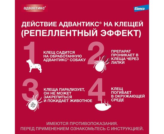 Имидаклоприд и перметрин, входящие в состав препарата, обладая синергидным эффектом, оказывают выраженное инсектицидное, акарицидное и репеллентное действие. Адвантикс® эффективен против имагинальных и преимагинальных и личиночных фаз развития блох (Ctenocephalides canis, Ctenocephalides felis), власоедов (Trichodectes canis), иксодовых клещей (Rhipicephalus sanguineus и Ixodes ricinus, Dermacentor reticulatus), паразитирующих на собаках, обеспечивает защиту животных от нападения комаров (Aedes aegypti, Culex pipiens), мух (Stomoxys calcitrans) и москитов (Phlebotomus papatasi, Phlebotomus perniciosus). Снижает риск возможной передачи животным трансмиссивных заболеваний, таких как: боррелиоз, риккетсиоз, лейшманиоз, а также возбудителя собачьего эрлихиоза (Ehrlichia canis) и др.