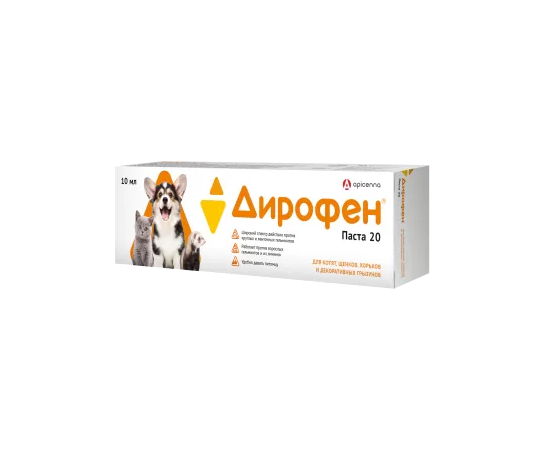 Дирофен-пасту 20 назначают котятам и щенкам с 3-недельного возраста, хорькам и декоративным грызунам с 3 — 4-недельного возраста, Дирофен-пасту 60 — взрослым собакам и кошкам, с профилактической и лечебной целью при нематодозах (токсокароз, токсаскаридоз, унцинариоз, анкилостомоз), цестодозах (тениидоз, дипилидиоз, эхинококкоз, дифиллоботриоз, мезоцестоидоз) и смешанных нематодо-цестодозных инвазиях.