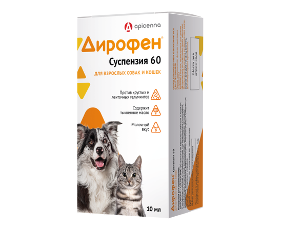 Дирофен-суспензию 20 назначают щенкам и котятам с 3-недельного возраста, хорькам и декоративным грызунам с 3 — 4-недельного возраста, Дирофен-суспензию 60 — взрослым собакам и кошкам, с профилактической и лечебной целью при нематодозах (токсокароз, токсаскаридоз, унцинариоз, анкилостомоз), цестодозах (тениидоз, дипилидиоз, эхинококкоз, дифиллоботриоз, мезоцестоидоз) и смешанных нематодо-цестодозных инвазиях.