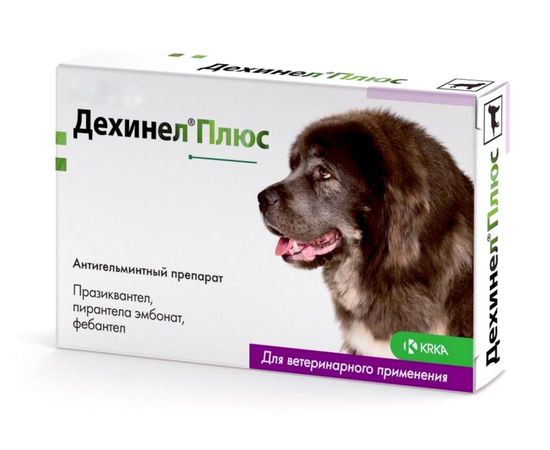 Антигельминтный препарат для собак Дехинел Плюс (международное непатентованное наименование: фебантел + пирантел эмбонат + празиквантел) в качестве действующих веществ в одной таблетке содержит: 525 мг фебантела, 504 мг пирантела эмбоната и 175 мг празиквантела, а в качестве вспомогательных компонентов — моногидрат лактозы, кукурузный крахмал, повидон К30, лаурилсульфат натрия, микрокристаллическую целлюлозу, коллоидный ангидрид кремния и стеарат магния. Дехинел Плюс представляют собой круглые таблетки, массой 2310 мг для применения внутрь, желтого цвета с темными вкраплениями со скошенными краями и крестовидной насечкой с одной стороны. Препарат расфасовывают в блистеры по 2 таблетки, которые вкладывают в картонные коробки.