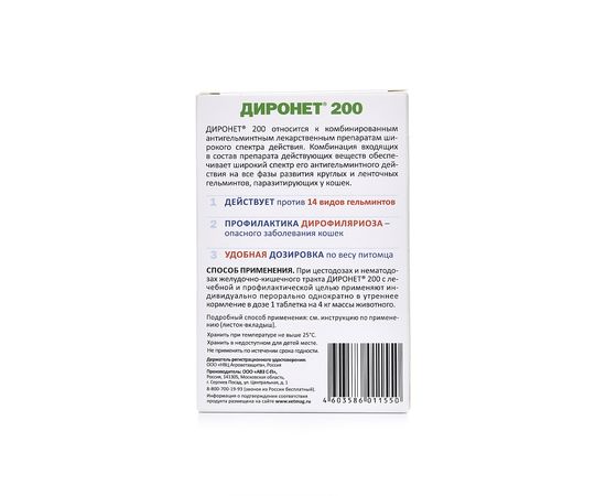 При цестодозах и нематодозах желудочно-кишечного тракта ДИРОНЕТ® с лечебной и профилактической целью применяют индивидуально перорально однократно в утреннее кормление в следующих дозах: из расчета 1 таблетка ДИРОНЕТ® 200 на 4 кг массы кошки.