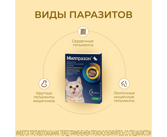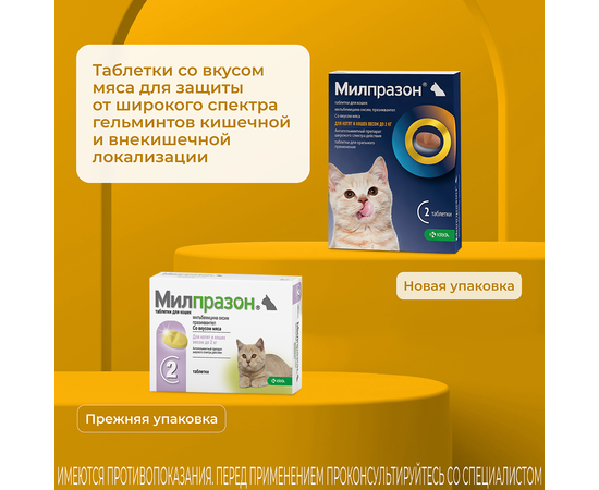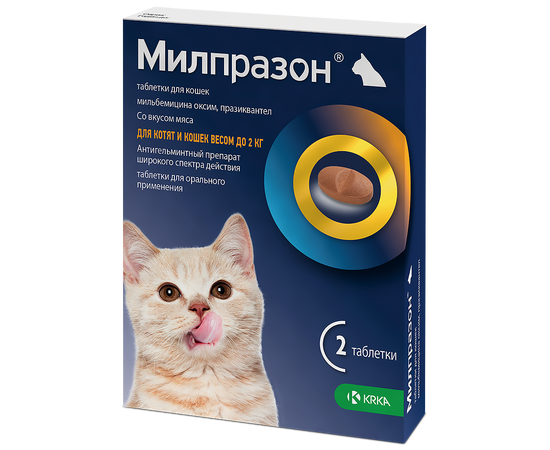 Милпразон — антигельминтный препарат для кошек весом более 2кг. Лекарственная форма: таблетки для орального применения. По внешнему виду представляют собой коричнево-красные овальные двояковыпуклые таблетки со вкусом мяса, покрытые пленочной оболочкой, с риской на одной стороне.