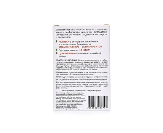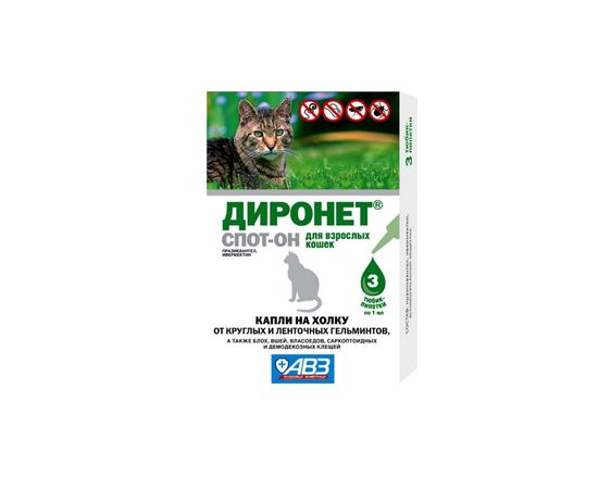 Противопоказанием к применению препарата ДИРОНЕТ® спот-он является повышенная индивидуальная чувствительность животного к компонентам препарата. Запрещается применять котятам моложе 2-месячного возраста, беременным и лактирующим самкам, больным инфекционными болезнями, ослабленным и выздоравливающим животным.