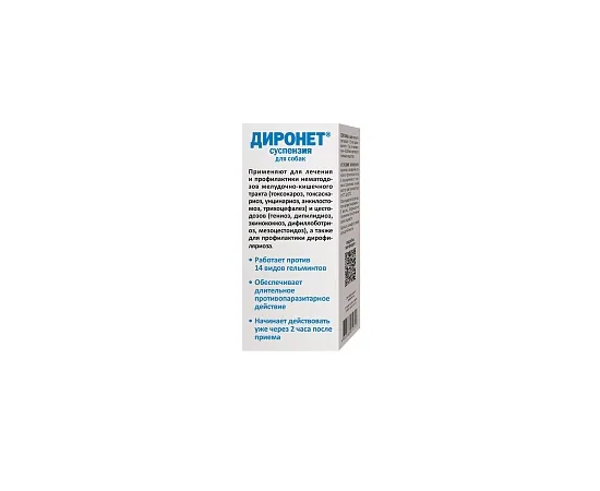 «Диронет» обладает широким спектром нематодоцидного и цестодоцидного действия, активен в отношении круглых и ленточных гельминтов, паразитирующих у собак и кошек, в т. ч. Toxocara canis, Т. cati, Toxascaris leonina, Uncinaria stenocephala, Ancylostoma caninum, Trichuris vulpis, Echinococcus granulosus, E. multilocularis, Diphyllobothrium latum, Dipylidium caninum, Multiceps multiceps, Taenia spp., а также личиночных фаз развития (микрофилярий) Dirofilaria immitis и Dirofilaria repens.