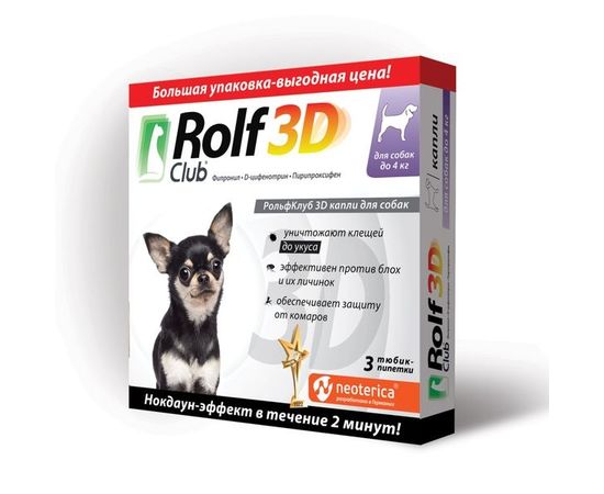 Капли Ролф Клуб 3D от блох и клещей для собак до 4кг (3 пипетки)