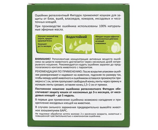 После вскрытия упаковки ошейник разворачивают и надевают на животное, подгоняя по размеру так, чтобы между шеей животного и ошейником оставался промежуток примерно в 1 см, затем пропускают свободный конец ленты через пряжку и излишек ленты срезают, оставляя конец 1,5-2 см от пряжки. Постоянное ношение ошейника защищает животное от насекомых до 3 месяцев, от иксодовых клещей до 5 недель. В случаях сильного заражения предварительно вымойте животное репеллентным зоошампунем БАРС®, а подстилку или домик животного обработайте инсектоакарицидным спреем БАРС® или инсектоакарицидным спреем БАРС® форте. Репеллентная концентрация активных веществ на коже достигается через 24 часа после надевания ошейника. Рекомендуется надеть ошейник заранее до предполагаемого контакта животного с паразитом. Защитный эффект ошейника не зависит от погодных условий и частоты купания животного. Водостойкая защита до 3 месяцев.