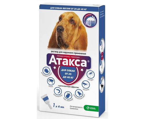 Атакса® — препарат для защиты собак от укусов иксодовых клещей, блох и комаров. Обладает длительным защитным и репеллентным действием: не только уничтожает, но и отпугивает паразитов на протяжении 4 недель! Применение Атаксы® снижает риск возможной передачи животным трансмиссивных заболеваний, таких как пироплазмоз (бабезиоз), боррелиоз, риккетсиоз, лейшманиоз, а также возбудителя собачьего эрлихиоза и др.