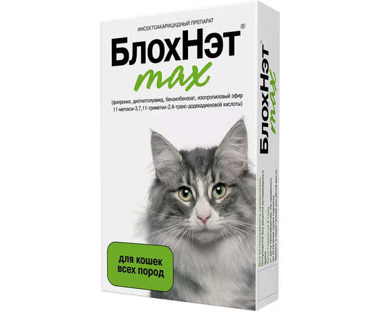 БлохНэт®max по степени воздействия на организм относится к умеренно опасным веществам (3 класс опасности по ГОСТ 12.1.007-76), в рекомендуемых дозах не оказывает кожно-раздражающего и резорбтивно-токсического действия, при попадании в глаза вызывает слабое раздражение. Препарат токсичен для кроликов, а также рыб и