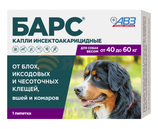 БАРС® капли против блох и клещей для собак в качестве действующих веществ содержат фипронил – 50 мг/мл, дифлубензурон – 1 мг/мл и дикарбоксимид (МГК-264) – 5 мг/мл и вспомогательные вещества