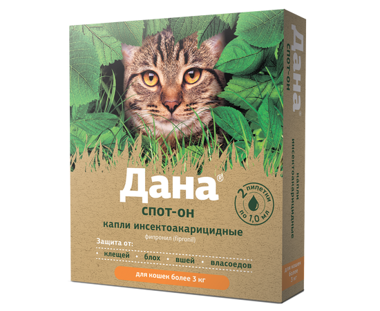 Дана® Спот-он назначают собакам и кошкам с 12-недельного возраста для лечения и профилактики энтомозов, вызываемых блохами, вшами и власоедами, акарозов, вызываемых саркоптоидными, иксодовыми и демодекозными клещами, пушным зверям – для лечения и профилактики отодектоза.