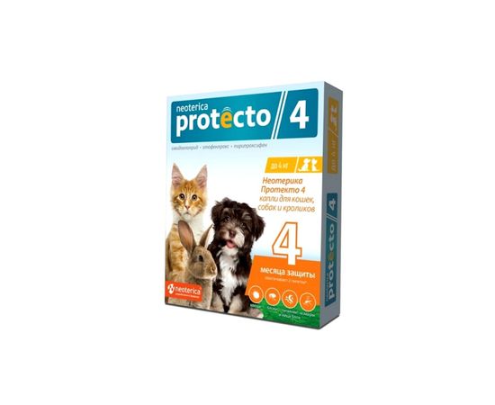 Неотерика Протекто 4 применяют кошкам, собакам и кроликам с 12-недельного возраста при энтомозах (блохи, вши, власоеды), отодектозе, псороптозе, нотоэдрозе, саркоптозе, демодекозе, поражении иксодовыми клещами и в целях защиты животных от нападения двукрылых кровососущих насекомых и профилактики трансмиссивных заболеваний (бабезиоз, боррелиоз, дирофиляриоз).