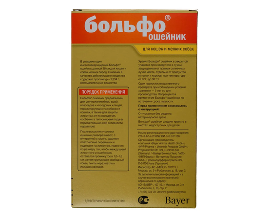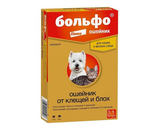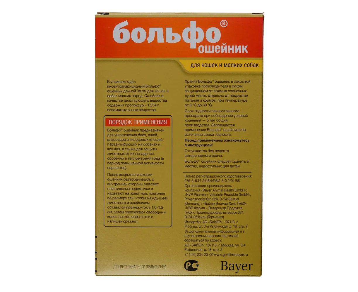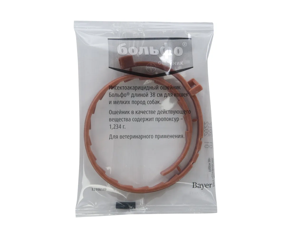 Больфо® инсектоакарицидный ошейник. Ошейник Больфо® выпускается в двух видах: для собак мелких пород и кошек – 38 см и для собак крупных и средних пород – длиной 70 см. По внешнему виду препарат представляет собой полимерную ленту коричневого цвета с нанесенным номером серии и 2 или 3 петлями для фиксации. Действующее вещество: пропоксур (4,442 г и 1,234 г в большом и маленьком ошейнике соответственно). Производитель – компания «Байер» (Германия).