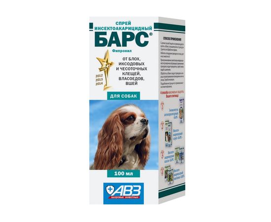 Барс спрей инсектоакарицидный для собак. Полиэтиленовые флаконы по 100 мл в картонных коробках и 200 мл.