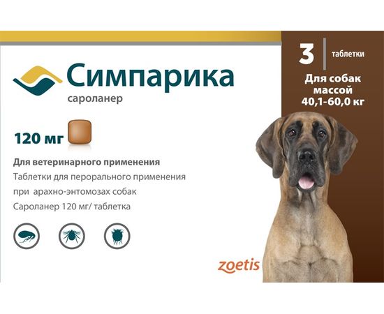 Препарат Симпарика от блох и клещей для собак 40-60кг (120мг), 3 таб в упаковке