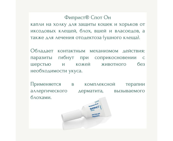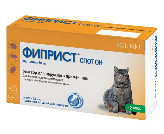 Фиприст Спот Он обладает инсектицидный лекарственный препарат контактного действия. Активен в отношении всех фаз развития вшей, блох, власоедов и клещей (иксодовые, хейлителлы, отодектосы), паразитирующих на собаках и кошках.