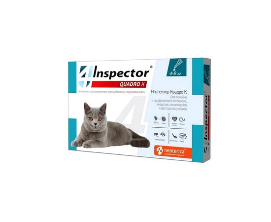 Инспектор Квадро К (Inspector Qu.adro К) - лекарственный препарат для лечения и профилактики у кошек энтомозов, отодектоза, нотоэдроза, акарозов. По внешнему виду представляет собой прозрачную маслянистую жидкость от бесцветного до желтого цвета.