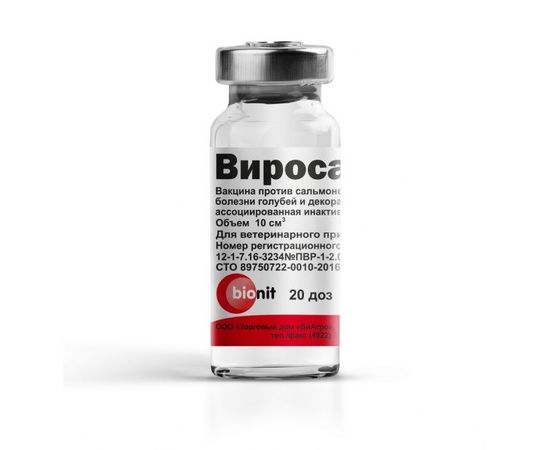 Ассоциированная инактивированная вакцина Виросальм предназначена для иммунизации голубей и декоративных птиц против сальмонеллеза и болезни Ньюкасла. Вакцина изготовлена и содержит не менее 1 млрд. микробных клеток каждого из штаммов Salmonella typhimurium (штаммы Д-1вt, М-2фt), Salmonella enteritidis (штамм 25 Яве) и вируссодержащей экстраэмбриональной жидкости куриных эмбрионов, зараженных вирусом болезни Ньюкасла штамма Н — не менее 106,4 lg ЭЛД50 единиц вируса, инактивированных формалином и сорбированных на полиэтиленгликоле. По внешнему виду вакцина представляет собой суспензию желтовато-серого цвета с рыхлым осадком, легко разбивающимся в гомогенную взвесь. Вакцину по 2, 10, 20, 40 доз расфасовывают в стеклянных флаконах, герметично укупоренных полимерными крышками и обкатанных алюминиевыми колпачками.