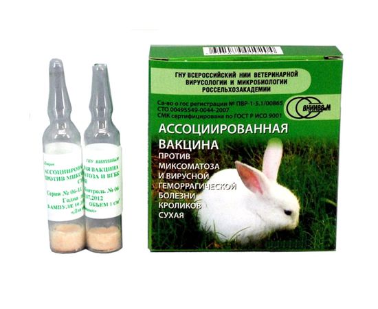 Вакцину ассоциированную против миксоматоза и вирусной геморрагической болезни кроликов изготавливают из штамма В-82 вируса миксомы кроликов и штамма В-87 вируса геморрагической болезни кроликов. Вакцина представляет собой пористую сухую массу от бледно-розового до светло-коричневого цвета. Вакцину расфасовывают по 0,5, 1, 2 мл в стерильные ампулы вместимостью 2, 3, 5, 6 мл, 4, 6 мл во флаконы емкостью 10 и 20 мл, содержащие 5-120 иммунизирующих доз. Флаконы закрывают пробками и закатывают алюминиевыми колпачками, а ампулы запаивают. На флакон (ампулу) с вакциной наклеивают этикетку или наносят несмываемой краской маркировку с указанием: краткого наименования организации – изготовителя, краткого названия биопрепарата (вакцина против миксоматоза и ВГБК сухая), номера серии, номера контроля, даты изготовления, количества доз и срока годности. Флаконы (ампулой) с вакциной упаковывают в картонные коробки с перегородками, обеспечивающими неподвижность и целостность флаконов и (ампул). На каждую коробку наклеивают этикетку с указанием ведомства и наименования предприятия-изготовителя, его товарного знака, наименования биопрепарата, номера серии, номера контроля, даты изготовления (месяц, год), срока годности, количества флаконов (ампул) в коробке, количества доз во флаконе (ампуле), условий хранения, обозначения настоящих ТУ и надписи "Для животных". В каждую коробку вкладывают наставление по применению вакцины.