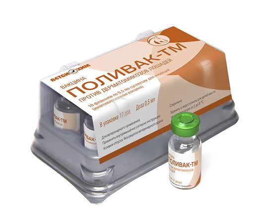Включает 8 видов и разновидностей грибов из рода Трихофитон и Микроспорум. Вакцина и упаковка адаптированы специально для применения на лошадях. По внешнему виду представляет собой однородную жидкость светло-коричневого цвета с тонким осадком на дне, легко взбалтывающимся при встряхивании. Выпускают в герметически закрытых флаконах или ампулах, содержащих 10 или 20 доз (1 доза составляет 0,5 мл).