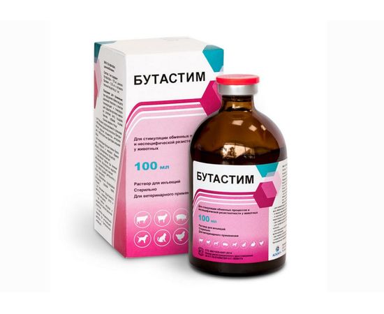 Бутастим относится к комплексным общеукрепляющим и тонизирующим лекарственным препаратам, нормализует метаболические и регенеративные процессы, оказывает стимулирующее действие на белковый, углеводный и жировой обмен веществ, повышает резистентность организма к неблагоприятным факторам внешней среды, способствует росту и развитию молодняка животных. Макроэргические соединения фосфора (АТФ и креатинфосфат) аккумулируют энергию, которая затем может быть использована для механической (мышечные сокращения), электрической (проведение нервного импульса), химической (биосинтез различных соединений) и электрохимической (активный транспорт веществ через мембраны) работы органов и тканей. Входящий в состав препарата бутафосфан способствует улучшению функции печени, стимулирует преобразование АДФ в АТФ, повышает двигательную активность гладкой мускулатуры, стимулирует образование костной ткани. Витамин В12 активизирует процессы кроветворения, синтеза нуклеиновых кислот, восстанавливает до нормы уровень лимфоцитов-супрессоров, участвует в синтезе метионина, способствует образованию гликогена, мобилизует запасы энергии, необходимые для образования дезоксирибозы и синтеза ДНК Бутастим по степени воздействия на организм относится к малоопасным веществам (4 класс опасности по ГОСТ 12.1.007), в рекомендуемых дозах не оказывает местно-раздражающего, сенсибилизирующего, эмбриотоксического, терратогенного, мутагенного и канцерогенного действия, не обладает кумулятивными свойствами.