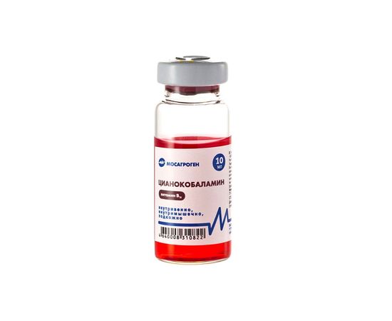 Цианокобаламин — лекарственное средство, содержащее в качестве действующего вещества цианокобаламин (витамин В12). В 1 мл лекарственного средства содержится 50, 200, 500 или 1000 мкг витамина B12, а также натрия хлорид и вода для инъекций. Цианокобаламин представляет собой прозрачную жидкость от светло-розового до красного цвета. Выпускают в форме раствора для инъекций, расфасованного по 5, 10, 20, 50 и 100 мл в стеклянные флаконы соответствующей вместимости.