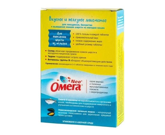 Лакомство мультивитаминное "Омега Neo+" с ржаным солодом "Для выведения шерсти из желудка" предназначено для поддержания здорового и активного образа жизни, поощрения, баловства и дрессировки кошек. "Омега Neo+" единственное отечественное лакомство, содержащее в составе новозеландские зеленые мидии, морские водоросли и Омега-3 кислоты. Солод обеспечивает продвижение комков шерсти в желудочно-кишечном тракте. Новозеландские зеленые мидии укрепляют хрящевую ткань суставов. Омега-3 кислоты поддерживают иммунитет и улучшают состояние кожи и шерсти. Пивные дрожжи – натуральный источник витаминов группы В.Не содержит сахара, соли, глютена, красителей и искусственных ароматизаторов.