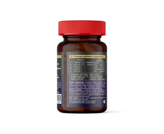 Ингредиентный состав: минеральный премикс (Mg (магний), Cu (медь), Zn (цинк), Mn (марганец), J (йод)) – 4,5-5,5%; витаминный премикс (витамин А (ретинол ацетат), витамин В1 (тиамина гидрохлорид), витамин В2 (рибофлавин), витамин РР (В3, никотинамид), витамин В5 (кальция - D - пантотенат), витамин В6 (пиридоксина гидрохлорид), витамин Н (биотин)) – 2,7-3,3%, сыворотка молочная сухая деминерализованная подсырная - 74,02428-90,47412%, DL - метионин - 1,575-1,925%, гиалуронат натрия (низкомолекулярный) – 0,9-1,1%, таурин - 0,9-1,1%, цитрат кальция - 0,9-1,1%, порошок мататаби (Actinidia polygama) - 0,9-1,1%, сублимированная печень говяжья (порошок сушеный из печени) или мясопродукты сушеные (порошок говядина) - 0,9-1,1%, аэросил А - 0,9-1,1%, L - карнитин - 0,45-0,55%, фукоидан - 0,45-0,55%, сквален - 0,45-0,55%, стеарат кальция - 0,45-0,55%, метафолин - 0,00072-0,00088%.