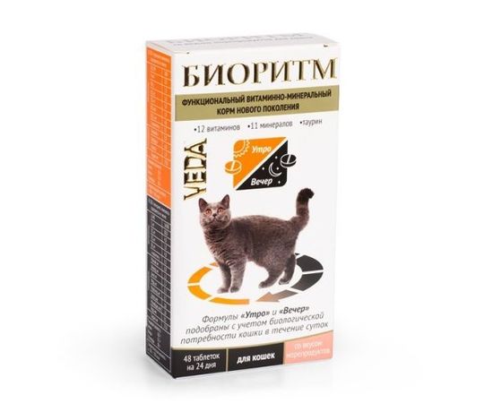 витаминно-минеральный комплекс БИОРИТМ является функциональным (оздоровительным) кормом нового поколения. Содержит полностью усваиваемые формы витаминов и микроэлементов, разделенные на 2 приема, которые удовлетворяют суточную потребность взрослой кошки, вне зависимости от вида питания.