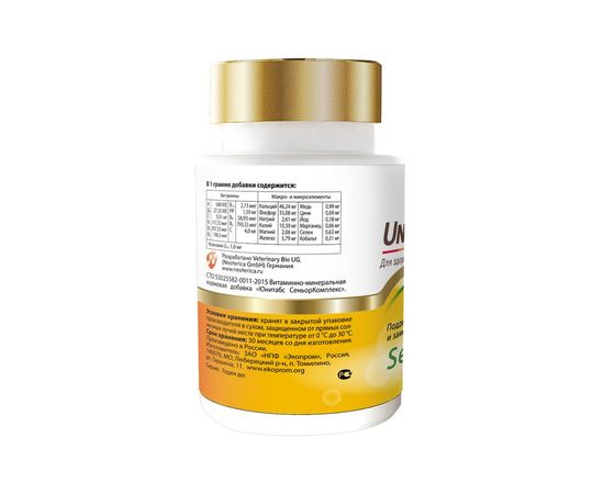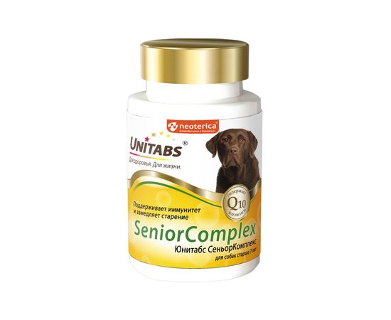 Юнитабс сеньор комплекс - минерально-витаминный комплекс для собак пожилого возраста. Состав сбалансирован по минеральным элементам и витаминам. Витамины группы B получены из пивных дрожжей. Собака получает полный набор витаминов, в том числе группы A, B, C, D, E, H, минеральные элементы, в т.ч. кальций и фосфор, йод, железо, селен, цинк. Суточная дозировка - 1 табл. на 10 кг веса. Продолжительность курса определяется ветеринарным врачом.