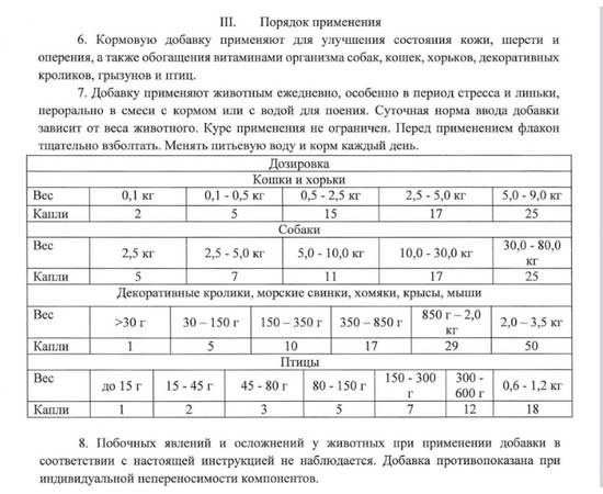 ормовую добавку применяют для улучшения состояния кожи, шерсти и оперения, а также обогащения витаминами организма хорьков, декоративных кроликов, грызунов и птиц.