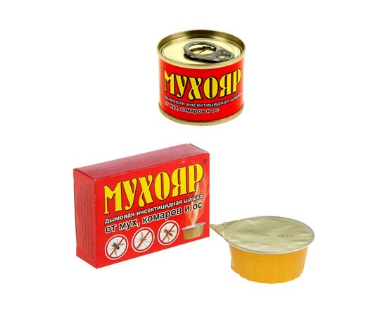 Средство находится в жестяной банке объемом 50 г. После поднесения спички начинает интенсивно дымить, проникая в самые дальние углы квартиры и уничтожая всех насекомых без исключения. При необходимости избавиться от осиных гнезд опасность быть ужаленным минимальна, поэтому применять Мухояр вы можете как в закрытом помещении, так и на открытой территории загородного дома.